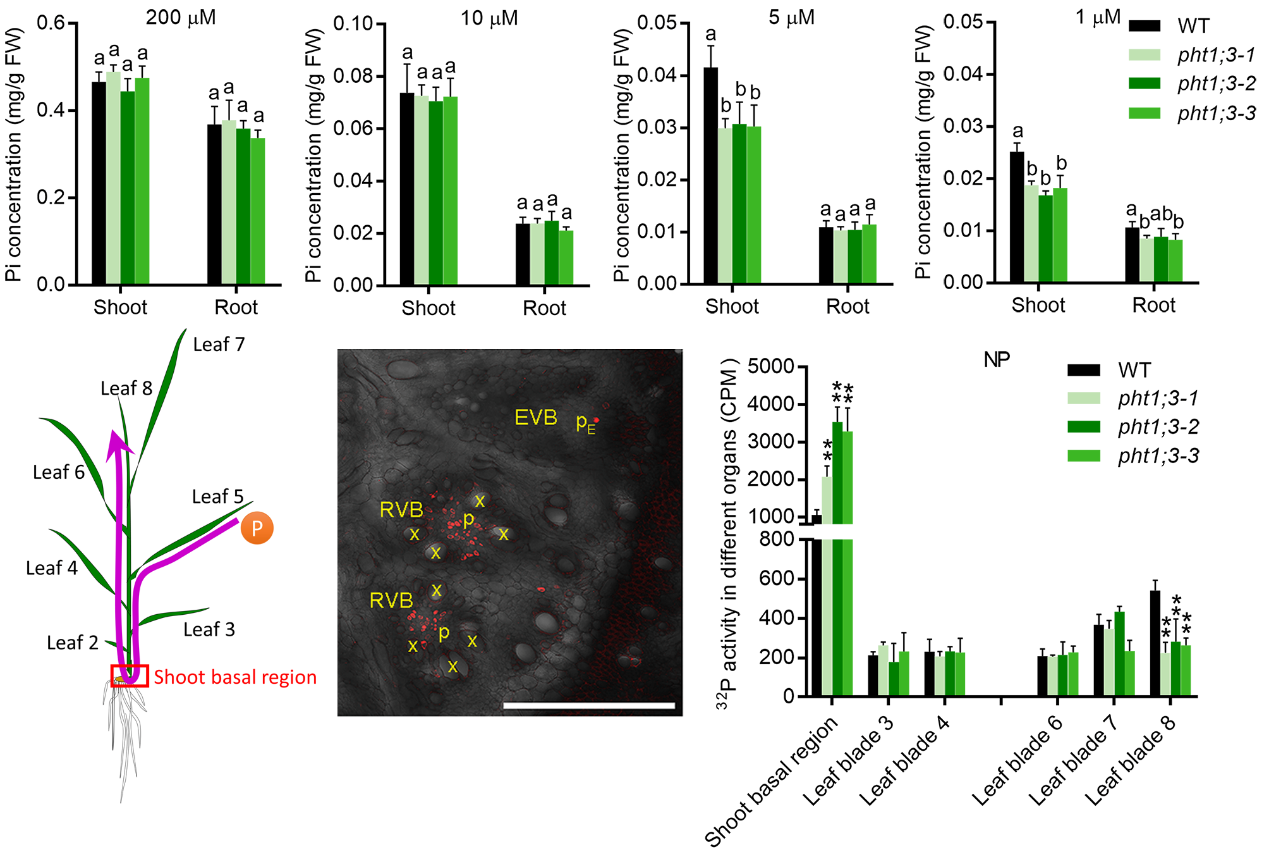 本研究以一个响应极度磷缺乏信号的磷转运蛋白基因OsPHT1;3为对象,发现无论在水稻的根部和老叶中,与其他已经报道的磷转运蛋白基因不同,OsPHT1;3 主要是在供磷浓度 ≤ 5μM 条件下强烈表达,参与磷素的吸收和从根部向地上部磷的转运。只有在供磷浓度 ≤ 5μM 时,OsPHT1;3 的突变才破坏磷的吸收以及向地上部的转运。此外,OsPHT1;3 还在基部节两种维管组织 (常规维管束和肥大维管束) 的韧皮部特异表达,并负责缺磷条件下磷素从老叶向新生叶的转运,而在 ospht1;3 突变体中这种转运受到阻碍。本研究为解析植物适应自然贫瘠土壤磷素的吸收和转运调控机制及磷高效作物育种提供了重要线索。