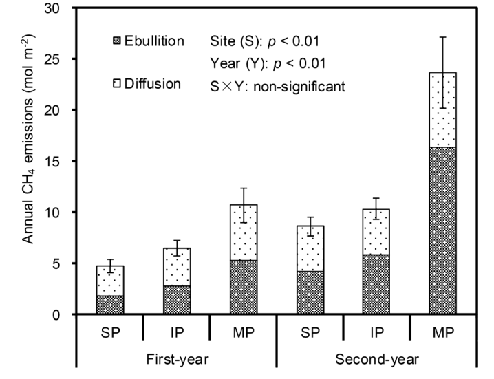 基于上述研究背景,在国家自然科学基金、973项目和人才项目等资助下,邹建文教授课题组采用箱法和扩散模型法相结合,对位于江苏省兴化市里下河地区一条灌溉稻田的运河支流开展为期两年的原位观测研究,并定量评估了扩散和汽包排放途径的相对贡献。研究结果明确了稻田灌溉河流CH4的年排放强度,表明灌溉河流是该流域CH4排放源的重要组成部分。其中,水稻生长季约占灌溉河流全年CH4排放总量的70%左右,夏季气泡排放途径占总量的80%以上。发现稻田烤田排水在减少稻田CH4排放的同时增加了灌溉河流CH4排放。论文指出了以往局限在稻田烤田CH4减排的研究认识可能存在性片面性,并提出了稻田流域水体CH4的减排对策。这是邹建文教授课题组在该流域继淡水养殖湿地温室气体排放观测研究成果在Environmental Science & Technology(5年影响因子7.25)上发文后取得的新成果。