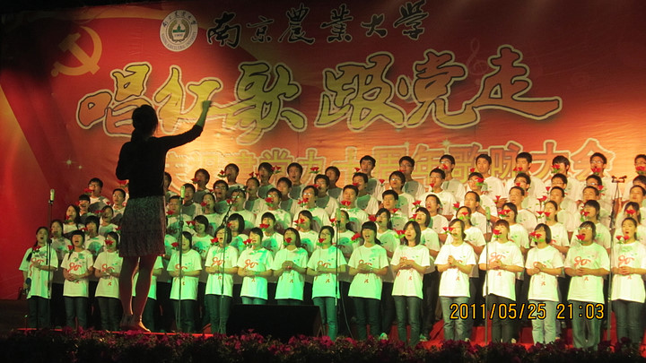 5月25日晚我校在文化广场举行了“唱红歌,跟党走”庆祝建党九十周年歌咏大会。 来自各学院、各单位的17支参赛队伍,用一支支红歌旋律表达了对中国共产党90岁生日的祝福。