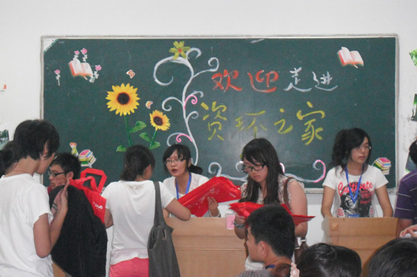 的新生报到处——位于主楼的135和139。迎新教室布置的简洁而温馨,给学弟学妹们一种温暖的资环大家庭的感觉。各项工作有条不紊的进行着,登记、注册、领取校园卡等手续在工作人员的引导下很快就可以完成。然后由专门的同学带新生到宿舍,领取生活用品办理入住手续并熟悉校园。