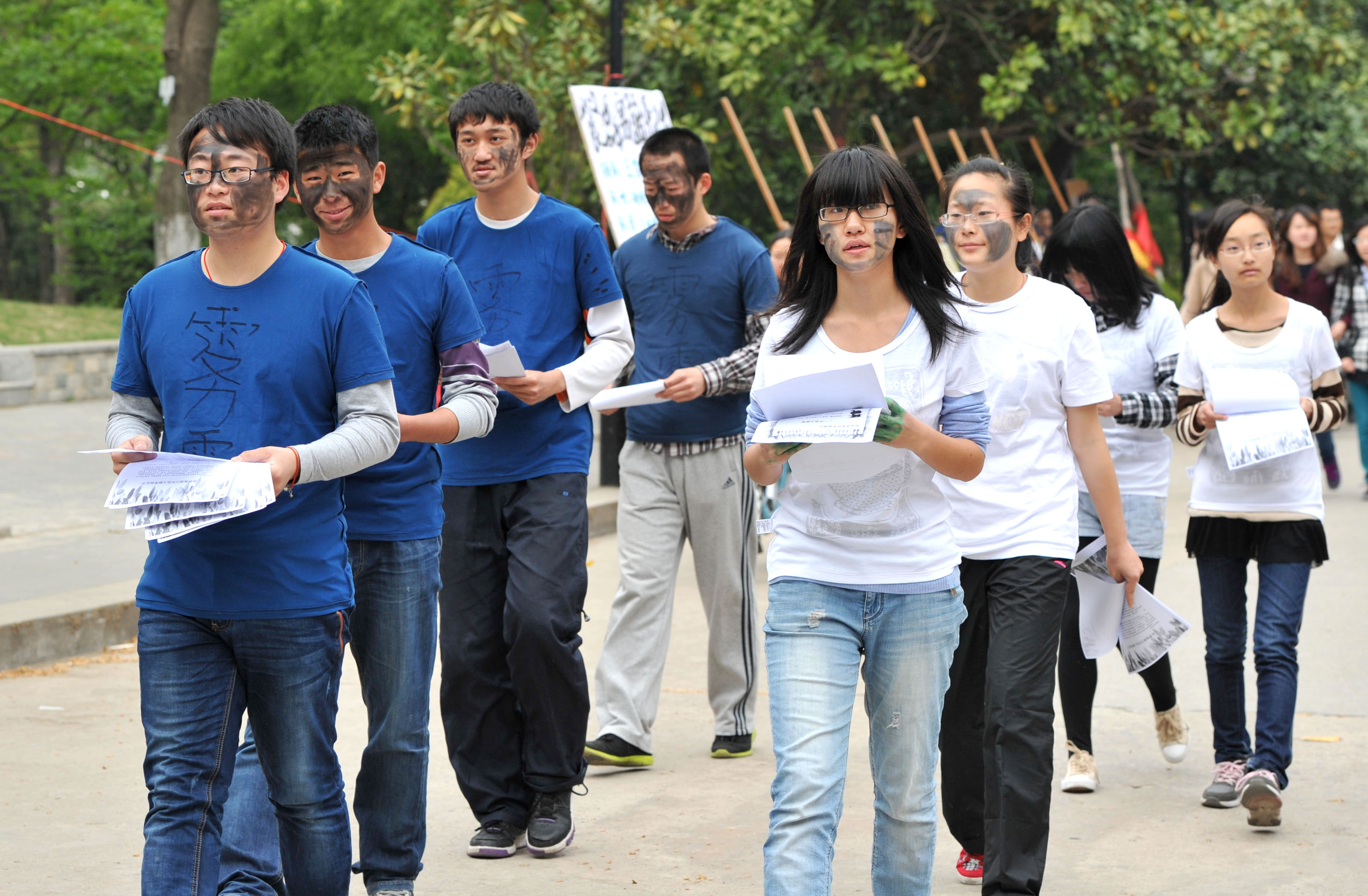 上午十一点,活动正式启动。八名志愿者分别穿着代表天空的蓝色上衣和代表水源的白色上衣,在脸和手臂上彩绘黑色及灰色图案,象征天空充满灰霾、水体已被污染的环境现状。志愿者们行走在教学楼、主楼、图书馆等校园标志性建筑之间,向过往同学发放环保倡议书和宣传单,呼吁大家关注空气污染、水污染等迫在眉睫的环境问题,认识到保护地球、保护环境的重要性。与此同时,91热爆