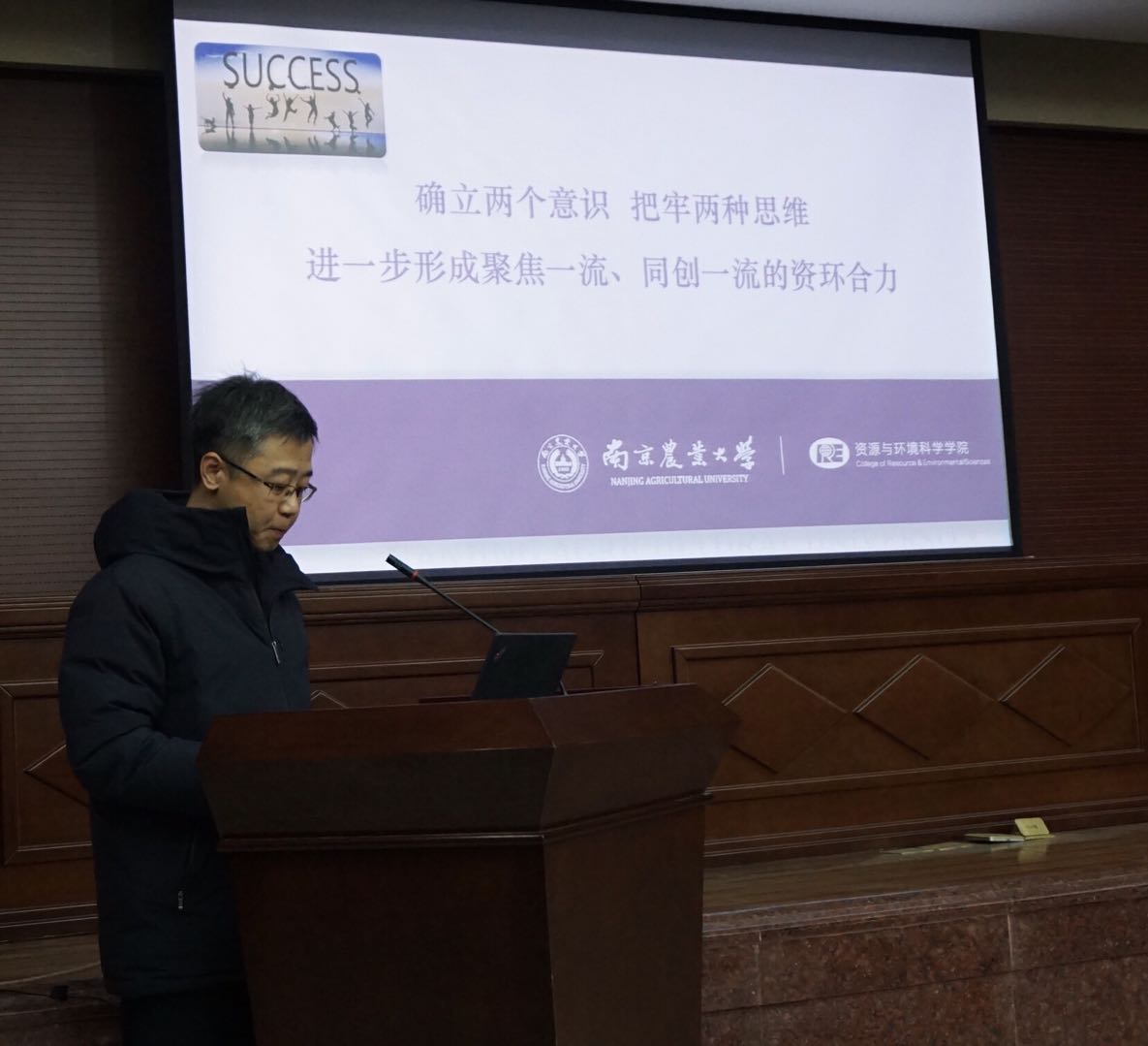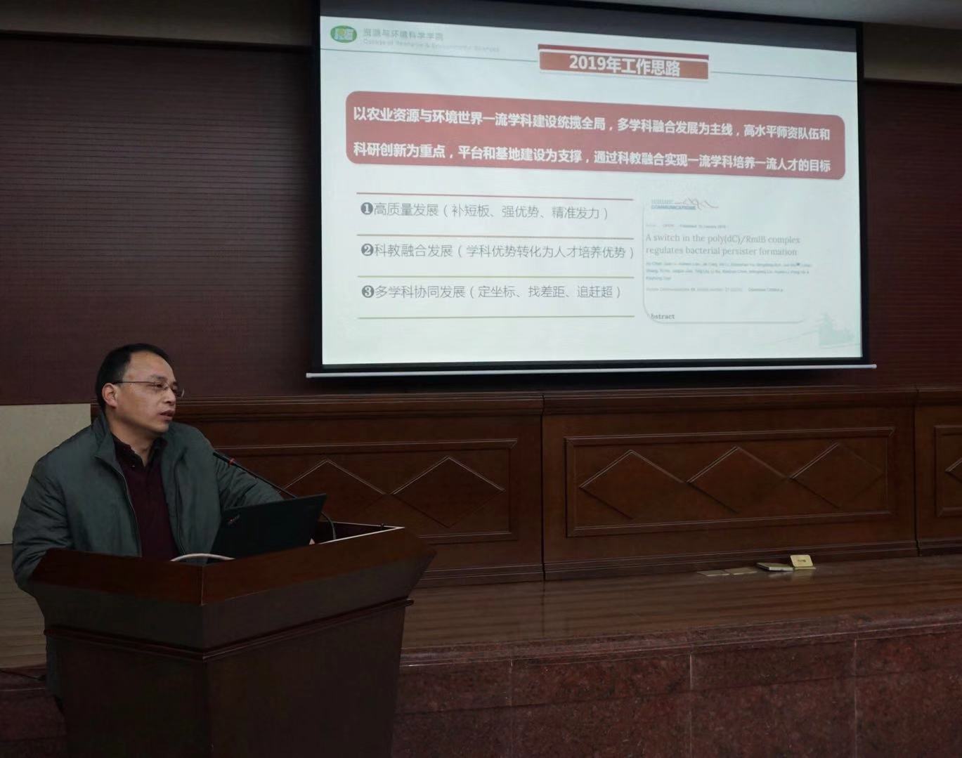 邹建文向大家介绍了2019年度上半年学院工作打算。他提出“以农业资源与环境世界一流学科建设统揽全局,多学科融合发展为主线,高水平师资队伍和科研创新为重点,平台和基地建设为支撑,通过科教融合实现一流学科培养一流人才的目标”的工作思路。他梳理了学院新学期的十项重点工作,强调传承诚朴勤仁的南农品格,弘扬开拓创新的资环精神。
