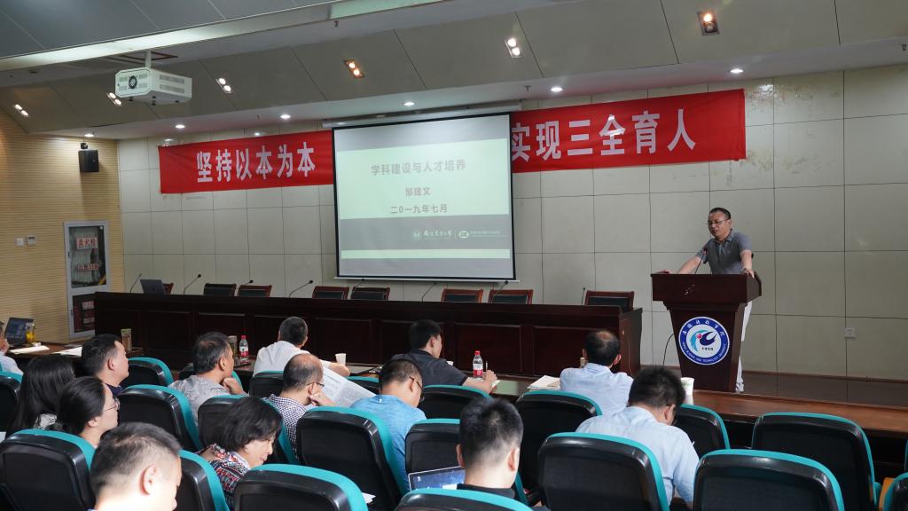 院长邹建文做了题为“人才培养与学科建设”的报告。他介绍了新时代背景下人才培养和学科建设的新要求及重要意义。他从新时代高等教育形势、学院本科教育的现状和第五轮学科评估对人才培养的要求等方面,全面分析了91热爆