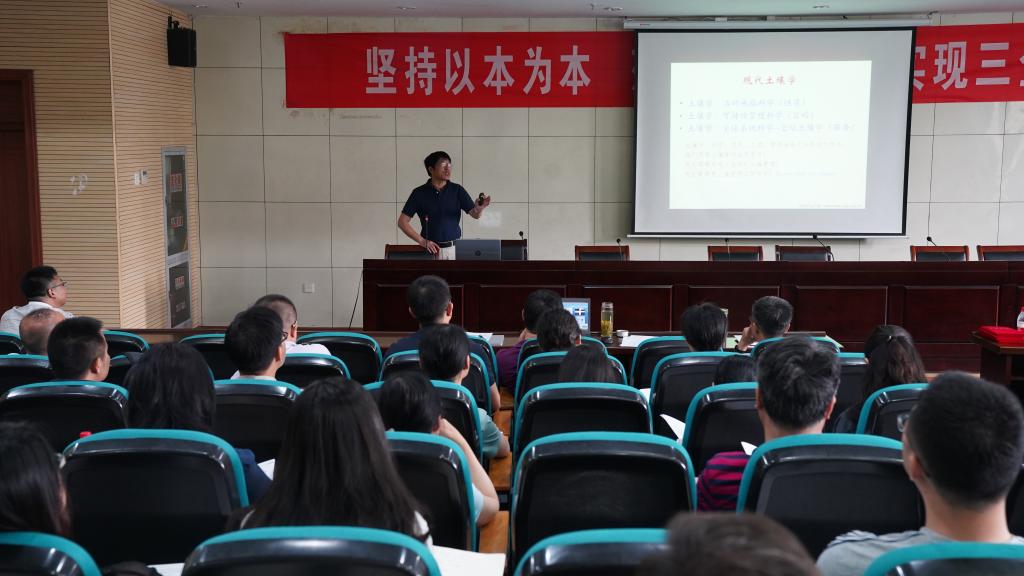 副院长张旭辉围绕新时代教育背景下课堂改革做了介绍。土壤学系潘根兴教授做了“追梦中的土壤学科”主题报告。环境科学与工程系系主任占新华就专业认证视角下2019版人才培养方案的课程大纲修订做了解读。