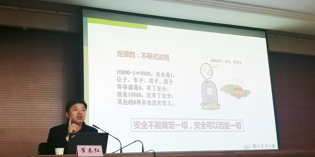 接着,崔春红处长就校园安全管理工作与师生进行交流。他从海因里希定律、墨菲定律、破窗效应、不等式法则等警示校园消防、治安、交通安全的重要性。崔春红处长指出我校卫岗校区作为历史悠久的老校区,风景宜人,但消防压力巨大,提醒学院师生要确保消防通道通畅、房间装修改造时,切记要使用符合规定的建筑材料、重视消防安全,发现隐患及时落实整改。要杜绝电动车进入楼宇充电、占用疏散通道、遮挡消防器材、安全出口上锁、防火区域乱扔烟头、宿舍违规使用热得快等现象出现。崔春红处长还介绍了火灾的基本知识,以及常见消防器材的使用,提醒师生掌握“三懂”“四会”“四个能力”,掌握自救技能。在治安安全方面,师生要特别注意扒窃、拎包、溜门等盗窃现象,手机莫放外衣兜,情浓莫忘护手机;贵重物品妥保管,必带就带,不必带不带;带好钥匙,随手关门。校园贷、P2P等网络诈骗现象也不容忽视,要谨记“沟通”是骗子成功的必然要求,没有沟通就没有伤害。在人与人、人与机器的沟通中必须保持清醒的头脑。校园交通安全方面,崔春红处长就学校近期即将出台的机动车、非机动车的规章制度进行了简单预告,意在能为师生的人身财产安全保驾护航。崔春红处长指出安全工作要从点滴做起,安全事故要从细微处防范,人人为我,我为人人。
