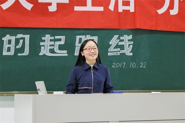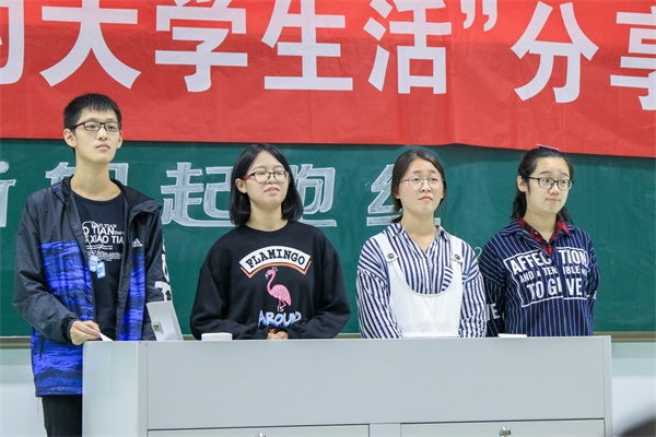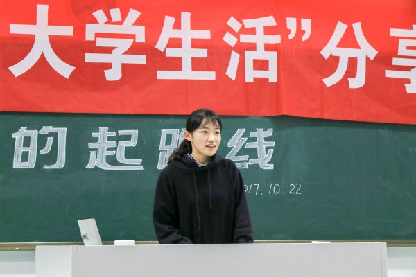 李昕玥向大家介绍了自己三年的优秀的体育生活,丰富的社团活动,并分享了自己在三年的大学生活中总结出来有关学习成绩,课外活动,科研经历,旅游出行,身体健康的经验,最后她希望大家“合理规划自己的时间,度过充实、不后悔的四年”。