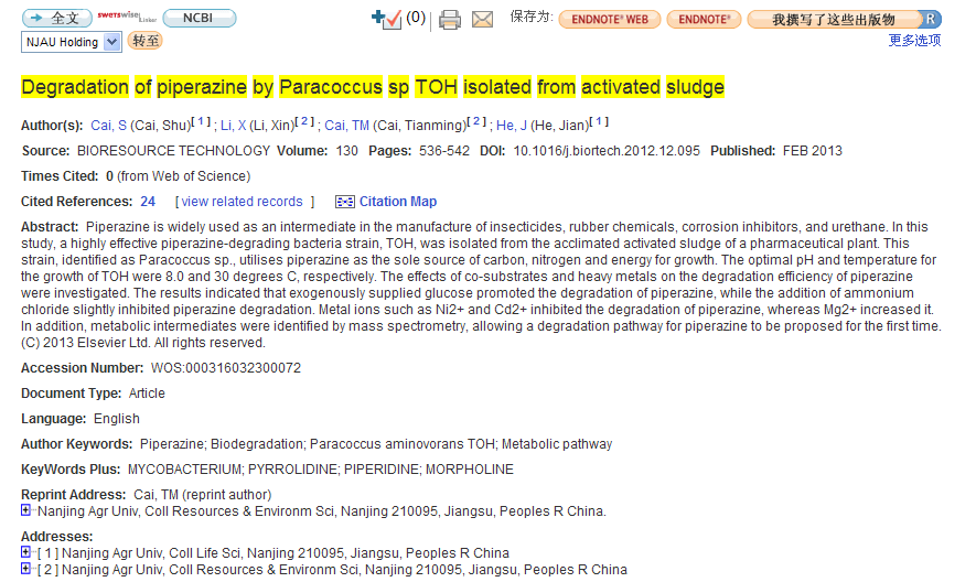 Degradation of piperazine by Paracoccus sp TOH isolated from activated sludge