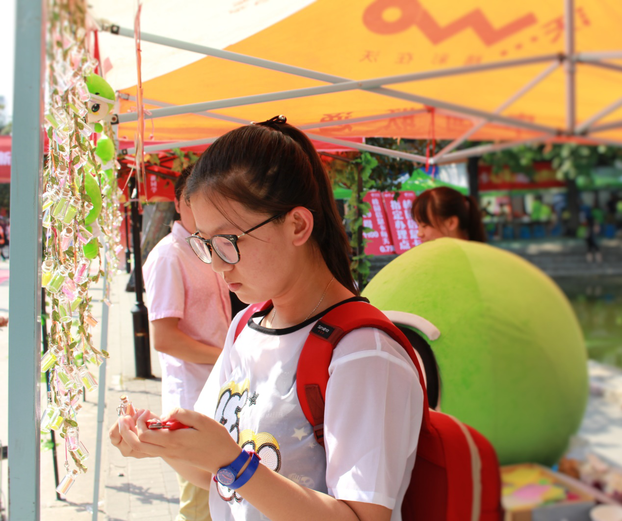 报到点和文化宣传点处可以发现,棚外悬挂着一个个小巧精致的漂流瓶。每个瓶中都装着一张小纸条,上面写着学姐学长们的联系方式和对新生的祝福语。希望能通过这样一对一的方式帮助新生更快得融入到新的生活与学习中。