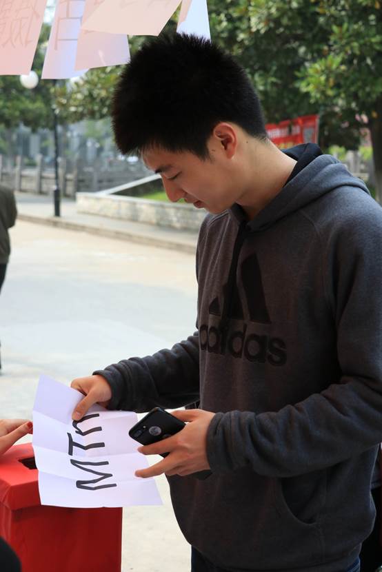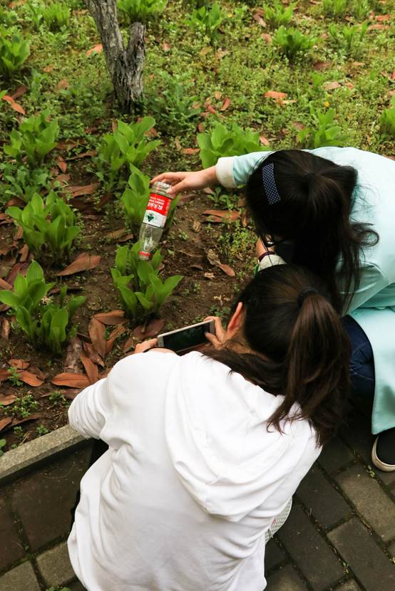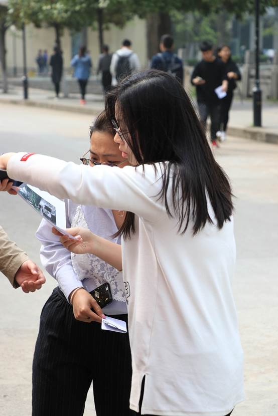 第一关卡——寻找相同字母。各组从玉兰路出发,按照抽取到的号码牌完成任务,最终回到起点记录各组用时。每组抽到的号码牌上有三个字母,在校园内找到与所抽到字母相似的图案拍照上传,即为任务完成。有的同学能很快地发现相似的字母完成关卡,也有同学迟迟找不到相似的图案而陷入“苦战”,但大家依旧兴趣高涨地进行着游戏。