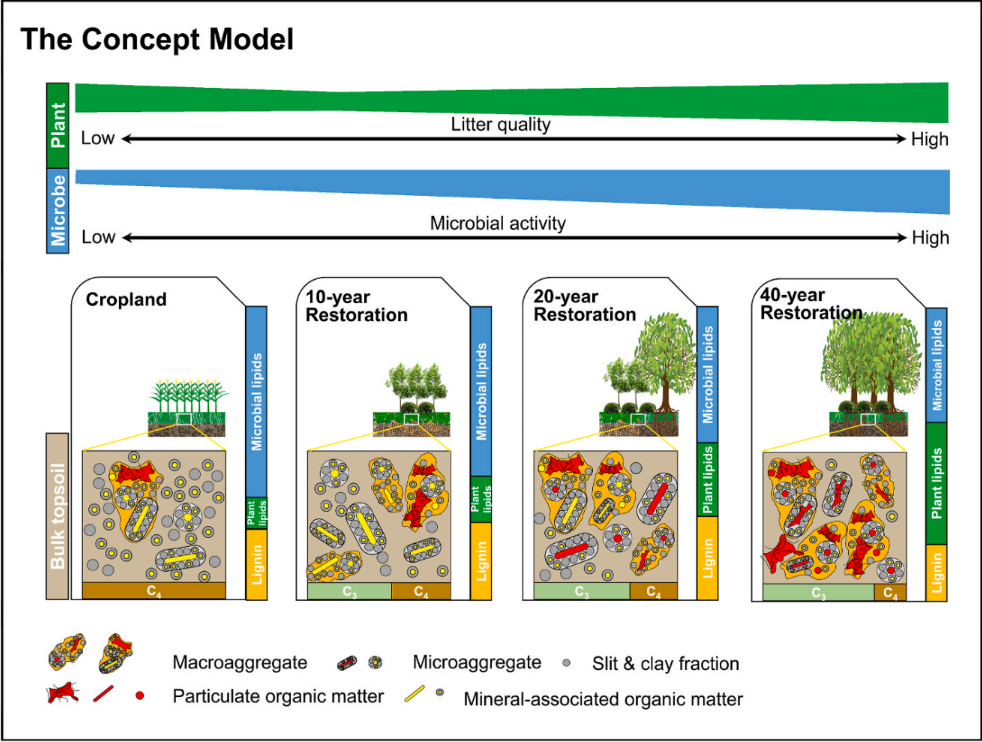 因此,本研究通过喀斯特土壤植物恢复的案例研究,剖析了退化土壤良好管理措施(例如植被恢复下)土壤有机质积累的土壤学机制,构建了团聚体分组-碳库分配-分子鉴定-碳基团区分-同位素识别等研究有机质积累土壤途径的“组合拳”方法,并提出POM / MAOM比值和植物-微生物源脂类丰度比值(PL/ML)以及生物标志物的香农多样性指数(H’)可以作为森林恢复下SOM积累变化的表征指标(Proxy)。