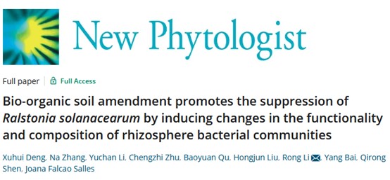 土壤微生物与有机肥团队关于利用生物有机肥防控植物土传病害的最新研究成果:Bio-organic soil amendment promotes the suppression of Ralstonia solanacearum by inducing changes in the functionality and composition of rhizosphere bacterial communities。该成果证明了长期施用生物有机肥可培育形成抑病型土壤,并揭示了此抑病土壤装配至植物根际的响应型细菌类群在抵御青枯菌入侵时的重要作用。