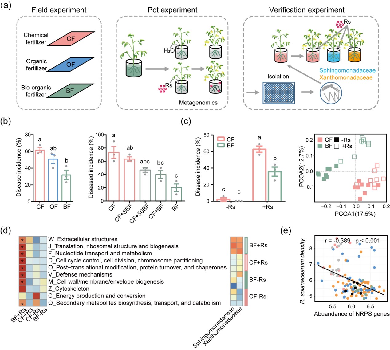 (a)实验流程;(b)生物有机肥防控番茄青枯病效果及其形成的抑病型土壤验证;(c)抑病型根际抵御病原菌入侵效果及细菌群落组成变化;(d)青枯菌入侵对根际细菌群落功能和关键类群的影响;(e)接种鞘氨醇单胞菌科和黄单胞菌科可培养菌株后根际NRPS基因丰度与青枯菌数量的相关性。