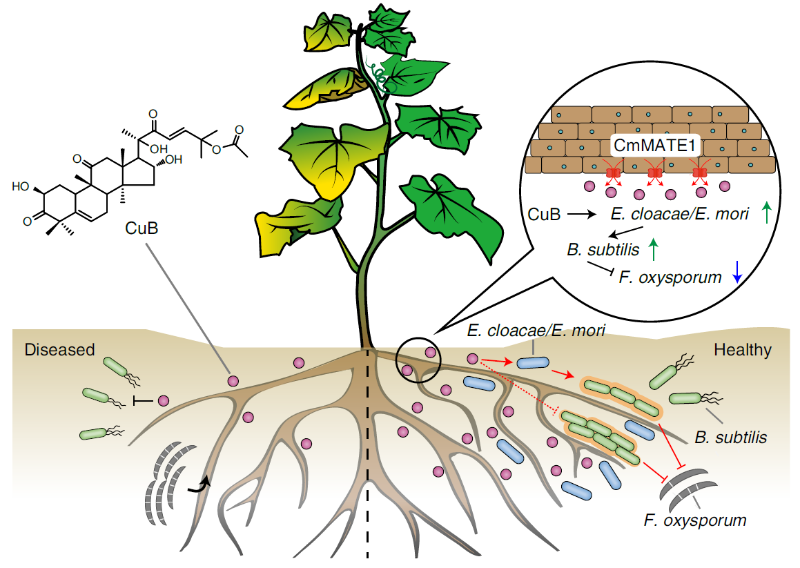 本研究以西甜瓜可向根际土壤中外排葫芦素为研究切入点,利用组学数据从甜瓜、西瓜基因组中分别鉴定到一个MATE转运蛋白基因(CmMATE1/ClMATE1),该基因不仅与葫芦素合成基因成簇分布,且被先前研究发现的葫芦素调控因子直接调控;该基因产生的蛋白可定向从根内向根外转运葫芦素B及葫芦素E。进一步通过宏基因组手段分析甜瓜根际微生物群落结构,并结合关键菌株分离培养和体外生化实验验证,发现根系分泌的葫芦素B可作为碳源促进根际肠杆菌生长,而肠杆菌又可促进根际典型的植物益生芽孢杆菌富集,从而建立了甜瓜对土传镰刀菌的高效防控体系。
