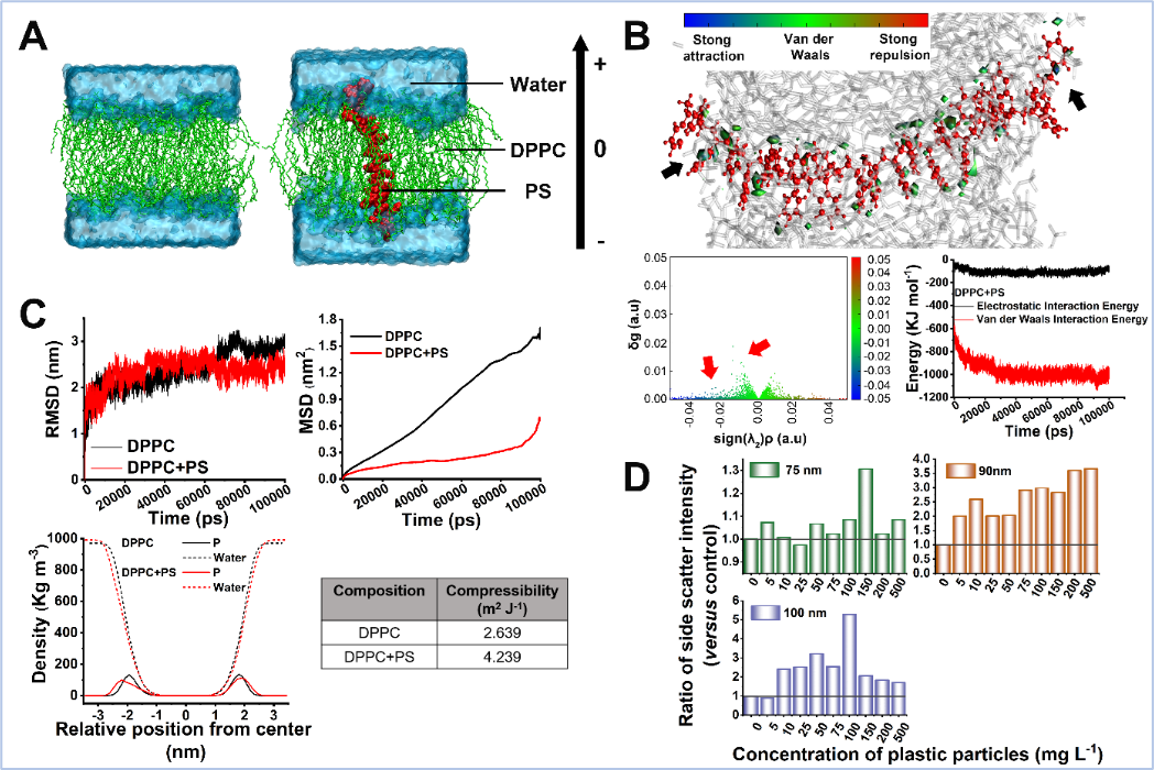 近年来,围绕环境中抗生素耐药性传播问题,高彦征教授团队开展了系列研究,取得了一些进展:发现微塑料颗粒不仅会富集环境中持久性有机物、提高其生物可给性(Environ. Int., 2022),而且纳米塑料颗粒还可通过抑制抗性质粒复制、与脂质双分子层互作(图3)等机制影响ARGs水平转移(Environ. Sci. Technol., 2022);发现蒙脱石颗粒通过胁迫损伤引起宿主细胞膜纳米孔洞等促进ARGs水平转移(Environ. Sci. Technol. Lett., 2020);借助量子化学计算等手段,阐明了金属氧化物纳米颗粒与抗性质粒结合机制及其对ARGs水平转移的抑制效应(Environ. Sci.: Nano, 2019)。结合以往研究,归纳与总结了共存污染物对抗生素耐药性传播的影响效应与原理(科学通报, 2022)。相关研究提升了人们对细菌耐药性风险的认识与理解,为其有效控制提供了参考依据。