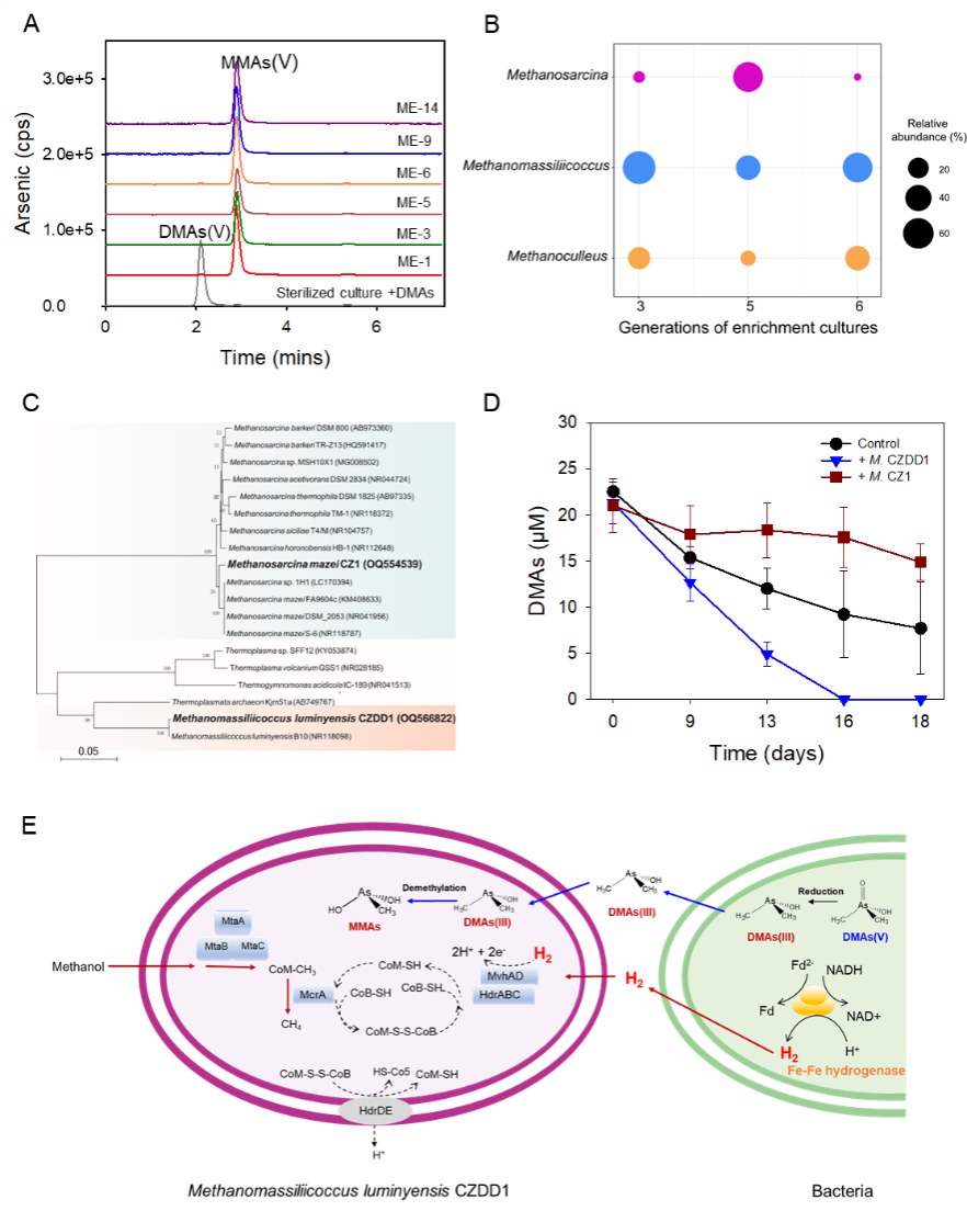 团队首先通过从水稻土中富集不同营养型的产甲烷古菌,发现甲基营养型产甲烷古菌富集培养对DMAs的脱甲基能力较强(图1A),且产甲烷马赛球菌Methanomassiliicoccus和产甲烷八叠球菌Methanosarcina是其中主要的产甲烷古菌(图1B)。随后,从上述甲基营养型富集液中分离得到两株甲基营养型产甲烷古菌Methanomassiliicoccus luminyensis CZDD1和Methanosarcina mazei CZ1,前者为H2依赖型的甲基营养型产甲烷古菌(图1C)。添加菌株CZDD1显著加速了富集液中DMAs脱甲基过程。相反,添加菌株CZ1抑制了富集液中DMAs的脱甲基过程。进一步研究发现,五价态DMAs [DMAs(V)]需要被还原为三价态DMAs [DMAs(III)]后才能被脱甲基,产甲烷马赛球菌CZDD1可将DMAs(III)脱甲基,而产甲烷八叠球菌CZ1则不能。此外,一些厌氧细菌如梭菌也辅助参与DMAs的脱甲基过程,这些厌氧细菌通过原位发酵产生H2供给马赛产甲烷球菌生长,并且将DMAs(V)还原为DMAs(III),为产甲烷马赛球菌提供脱甲基底物(图1E)。