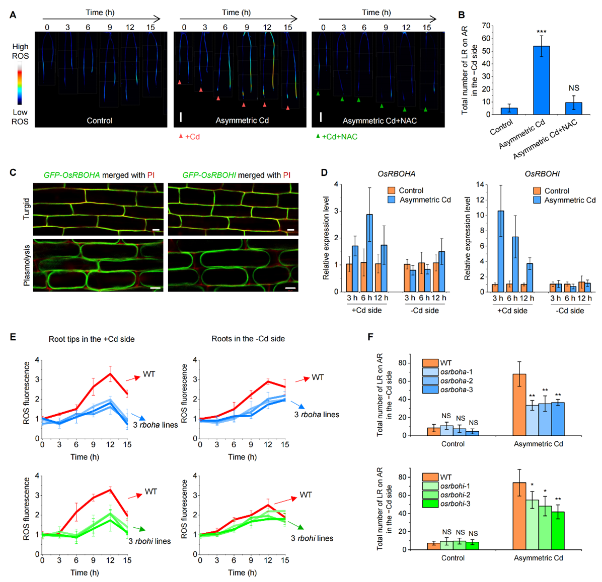 (A) 非对称镉胁迫诱发根尖ROS响应并激活系统性ROS信号; (B) ROS清除剂抑制根系规避非对称镉胁迫的作用;(C) OsRBOHA与OsRBOHI定位于细胞质膜;(D) 镉胁迫诱导OsRBOHA与OsRBOHI 转录上调;(E) and (F) OsRBOHA与OsRBOHI参与ROS介导根系规避非对称镉胁迫。