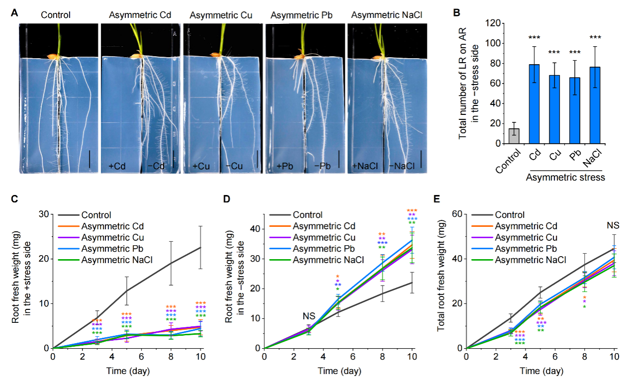 该研究首先发现,在局部的重金属(镉、铜、铅)和盐(NaCl)胁迫处理下,胁迫区域水稻根系生长受抑制,而无胁迫区域根系快速形成大量侧根。植物通过这一生长策略向无胁迫区域投资根系生物量,进而规避局部的重金属或盐胁迫(图1)。