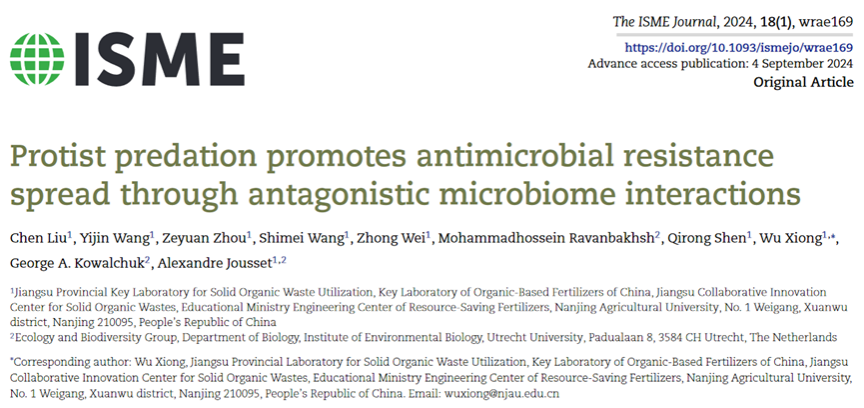 Chen Liu, Yijin Wang, Zeyuan Zhou, Shimei Wang, Zhong Wei, Mohammadhossein Ravanbakhsh, Qirong Shen, Wu Xiong, George A Kowalchuk, Alexandre Jousset, 2024. Protist predation promotes antimicrobial resistance spread through antagonistic microbiome interactions. The ISME Journal, wrae169. //doi.org/10.1093/ismejo/wrae169