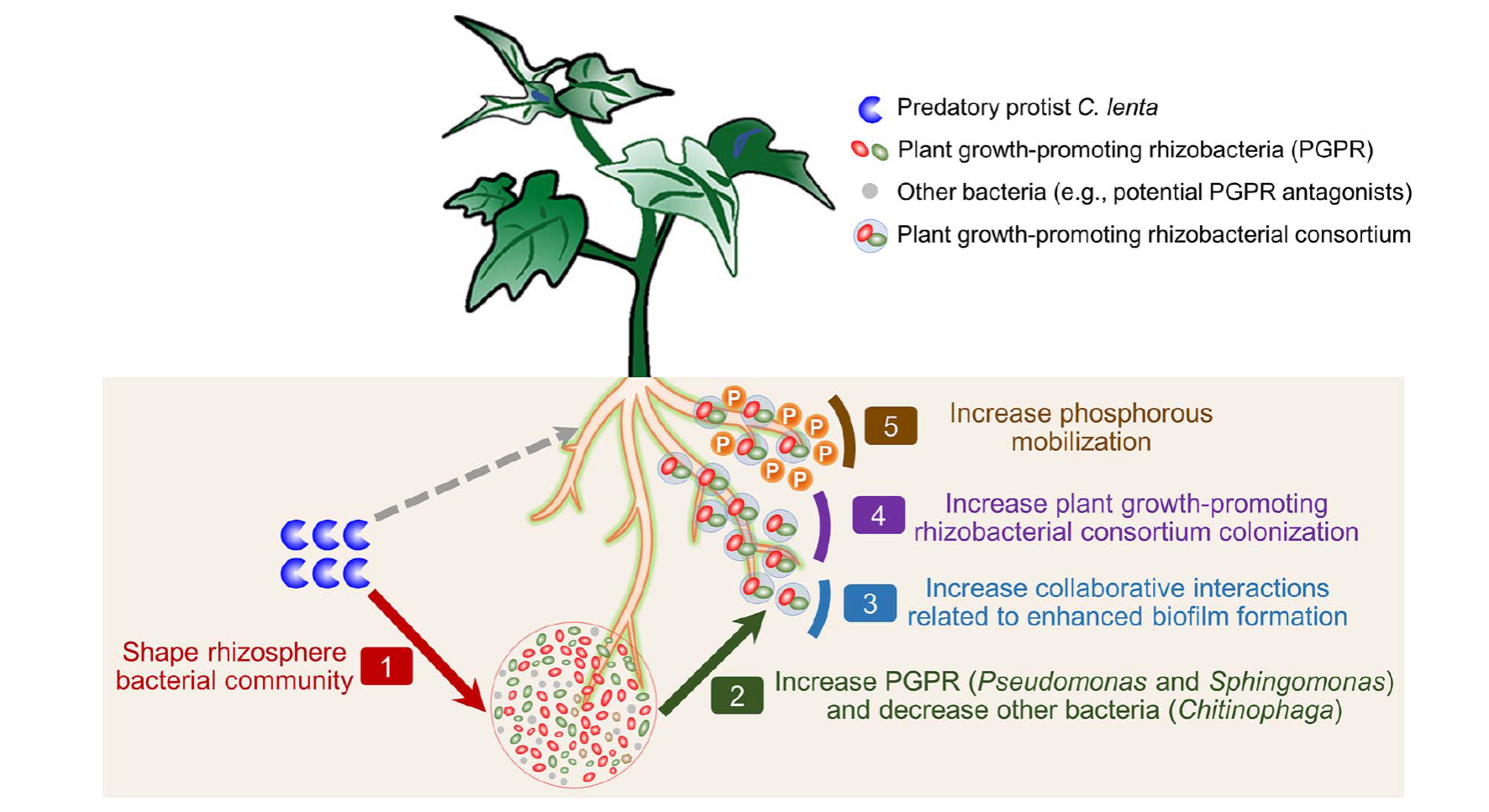 根际细菌影响植物生长。这些细菌既受到根分泌物自下而上的控制,也受到捕食者自上而下的控制,尤其是原生生物。然而,原生生物-细菌-植物三角关系中相互联系的背后机制仍不清楚。