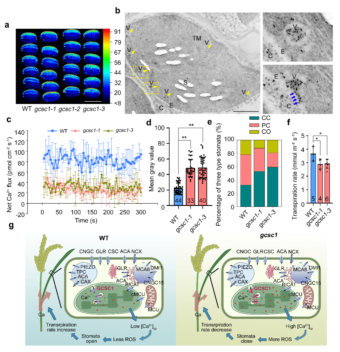 a,gcsc1突变体籽粒钙含量升高;b,GCSC1定位于叶绿体囊泡;c,gcsc1突变体叶绿体Ca2+外排降低;d,gcsc1突变体H2O2含量升高;e,gcsc1突变体气孔关闭比例增加;f,gcsc1突变体叶片蒸腾速率下降;g,GCSC1调控水稻籽粒钙积累的模式图。