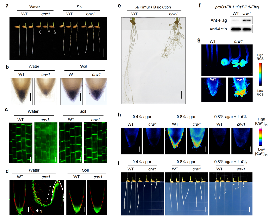 a-d. crw1突变体在水培和土培条件中的(a)根系表型、(b)根冠、(c)OsPIN2蛋白极性定位和(d)根尖生长素分布; (e)异常的向地性机制导致crw1在营养液中根系持续卷曲生长;f-g. 增强的乙烯激活信号通过ROS导致crw1根系在水培中卷曲生长;(f)OsEIL1蛋白在crw1根中积累;(g)crw1根尖ROS增强;h-i. crw1在0.4%和0.8%琼脂中(±钙信号抑制剂LaCl3)生长时的(h)根冠钙信号和(i)根系表型。