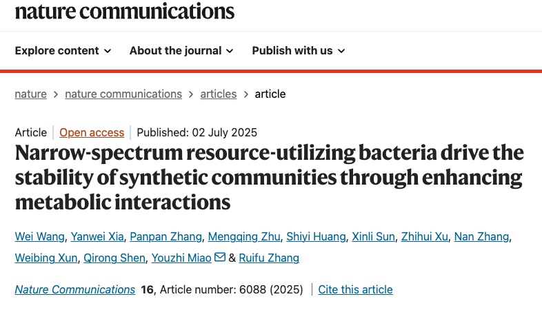 沈其荣院士团队张瑞福教授课题组在Nature Communications上发表了最新研究成果“Narrow-spectrum resource-utilizing bacteria drive the stability of synthetic communities through enhancing metabolic interactions”。该研究发现,植物关联细菌群落在环境碳源利用模式上呈正态分布特征,进化上存在倾向于利用较多或较少碳源种类的宽谱和窄谱资源利用菌株(Broad/Narrow-spectrum resource-utilizing bacteria,BSR/NSR),进一步揭示了植物关联细菌的多资源利用能力与代谢互作潜力呈显著负相关,表明BSR与NSR细菌在生存进化上的“代谢自主型”和“代谢互助型”的策略差异。通过整合基因组代谢模型、根际原位检测、物质回补和代谢组分析等手段,构建并验证了以窄谱资源利用细菌为互作网络核心的多功能稳定菌群合成策略。该研究为不同生境下细菌合成群落的理性组装提供了新思路。