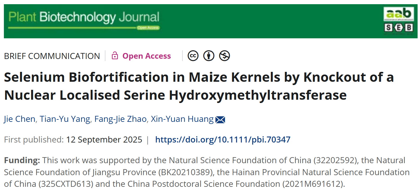 黄新元教授团队在《Plant Biotechnology Journal》发表题为“Selenium biofortification in maize kernels by knockout of a nuclear localised serine hydroxymethyltransferase”的论文。该研究通过突变玉米核定位丝氨酸羟甲基转移酶ZmSHMT5,显著提高了玉米籽粒中硒(Se)和硫(S)的积累,并改善了氨基酸组成,为玉米硒营养强化提供了新的育种靶点。