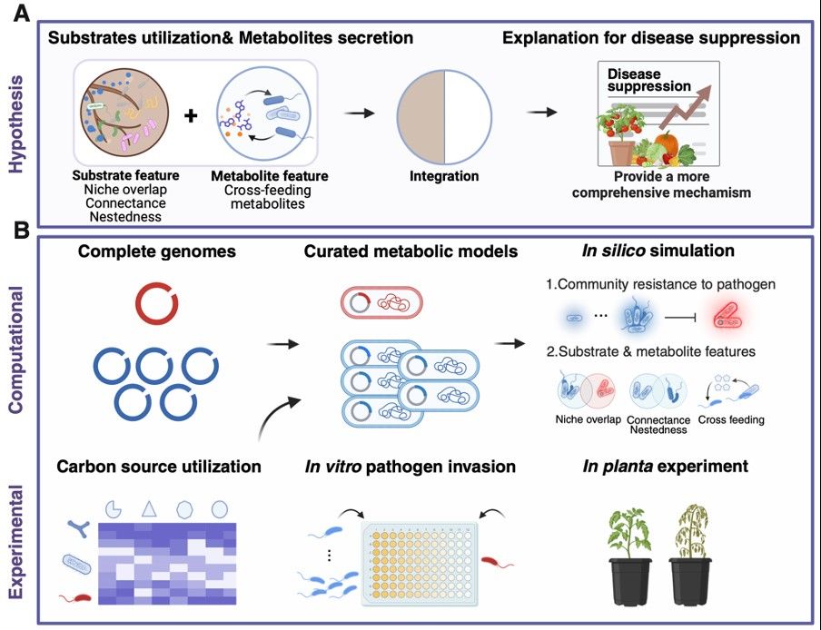 土传植物病原菌肆虐全球,严重威胁粮食安全。植物根际富含大量碳源,是土壤微生物活动的重要热区,也是抵御土壤病原菌入侵的第一道防线。然而,根际微生物组多样、营养环境复杂,如何高效地预测菌群抑病能力仍存在重大挑战。此外,已有大量研究表明高多样性的菌群抑病能力更强,但菌群内部及其与病原菌的营养互作机制尚未清楚探明。阐明上述科学问题对于理解土壤微生态健康、实现农业可持续生产具有重要科学意义。