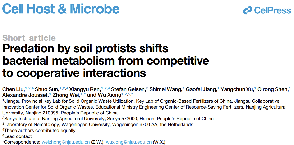 已毕业博士刘宸(现任湖南农业大学资源学院讲师)、博士研究生孙硕和任翔宇为论文的共同第一作者,熊武教授和韦中教授为论文的通讯作者,沈其荣院士、徐阳春教授、王世梅教授、江高飞教授、Alexandre Jousset教授、以及荷兰瓦格宁根大学Stefan Geisen助理教授共同参与并指导了该研究工作。同时,感谢李荣教授与徐志辉教授在本研究过程中提供的帮助与讨论。