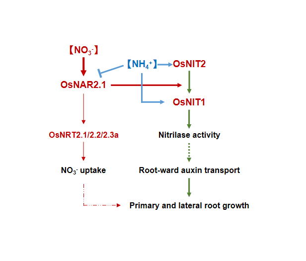 徐国华课题组之前已经发现硝运输辅助蛋白OsNAR2.1在水稻根系响应和吸收硝中起关键作用(Feng et al., 2011; Yan et al., 2011; Liu et al., 2014; Huang et al., 2015)。本研究利用Pull-Down,酵母双杂交和免疫共沉淀实验揭示了OsNAR2.1与两个腈水解酶蛋白OsNIT1、OsNIT2存在蛋白互作。OsNAR2.1、OsNIT2与OsNIT1共表达可显著提高OsNIT1水解吲哚乙腈(IAN)为吲哚乙酸(IAA)的能力。敲除OsNAR2.1抑制OsNIT1和OsNIT2的表达,而敲除OsNIT1和OsNIT2则不影响OsNAR2.1的表达以及根系吸收硝的速率。在供硝条件下,分别敲除OsNAR2.1,OsNIT1,OsNIT2,尤其是同时敲除OsNAR2.1和OsNIT2,导致主根变短和侧根密度的下降。在供铵条件下,OsNAR2.1的表达受到抑制,但OsNIT1和OsNIT2的表达增强,敲除OsNAR2.1不影响根系生长,但敲除OsNIT1和OsNIT2仍导致主根变短和侧根密度的下降,增强GH3家族基因和PIN2基因的表达,抑制生长素(3H-IAA)向根尖的分配。