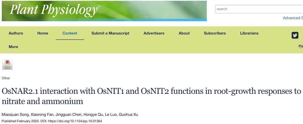 徐国华教授为通讯作者题为“OsNAR2.1 interaction with OsNIT1 and OsNIT2 functions in root-growth responses to nitrate and ammonium”的研究论文,报道了在硝和(或)铵供应条件下水稻根系生长的调控机制。