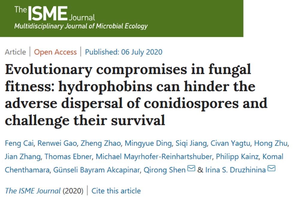 沈其荣教授团队以木霉菌为研究材料,通过生态遗传学方法,解析了一类表面活性小分子蛋白Hydrophobin(HFB)参与真菌分生孢子传播,进而影响其环境适应性与物种分化的分子机制,相关研究结果以“Evolutionary compromises in fungal fitness: hydrophobins can hinder the adverse dispersal of conidiospores and challenge their survival”为题发表于The ISME Journal上。