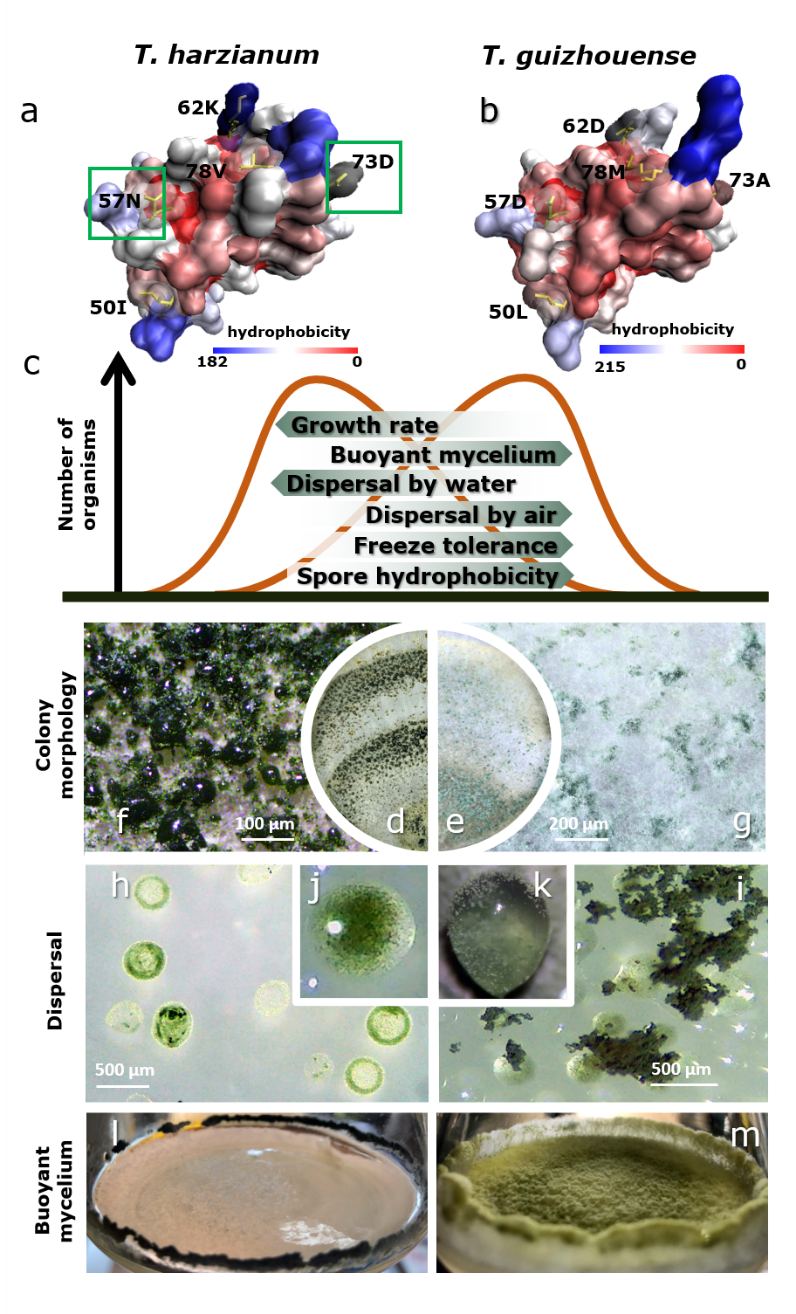 真菌进化生物学由于化石证据的缺乏、群体间生活史迥异以及同时具有无性和有性生殖现象等问题而发展相对缓慢;另一方面,也正是因为这些独有的特性,真菌具有高度生态可塑性,因而可作为进化生物学研究的极佳对象。高等丝状真菌通过在分生孢子表面“涂”上一层由表面活性小分子蛋白HFB组成的“疏水涂层”而实现孢子的风媒传播等功能。研究人员针对姐妹种木霉T. harzianum(Th)和T. guizhouense(Tg)的高表达hfb基因(hfb4和hfb10)构建了基因敲除突变体库,并分别对突变体进行了风媒和水媒的传播模拟试验,发现不同菌种有各自偏好的传播方式。研究人员对突变子进行抗逆性、生长和繁殖能力测试,发现HFB4的移除不仅显著影响真菌的生态适应性(Fitness),且同一HFB对真菌适应性的贡献力即便在遗传背景相近的菌株间也差异显著。基于此,研究人员分别对两个种群的hfb4(及hfb10)进行了自然选择压力计算,发现来自Th的hfb4受到强正向选择压力驱使。结合其生理生态习性(图1),研究人员猜测,Tg可能起源于水生环境,其孢子为脱离亲代生境,需要通过风媒传播至别处,且在高空中传播要求其孢子可以耐低温和UV照射,Tg具有上述特征;而Th则更偏向于利用雨水或昆虫进行传播,其确切的传播偏好有待进一步研究。在整个进化历程中,hfb4对菌株生态适应性的净贡献率是物种多个指标或特性进化权衡(compromise)的结果,例如hfb4的存在可提高Tg孢子的风媒传播能力,但却会相应“牺牲”掉一些耐低温特性。