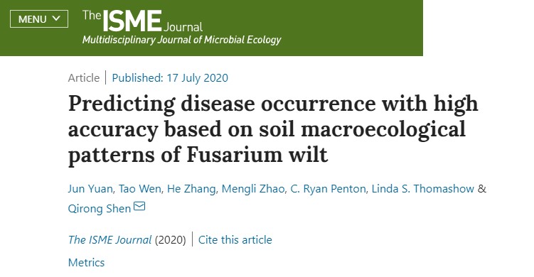当地时间7月17日,我校沈其荣教授课题组通过对全球1500多个土壤测序样品的整合分析,在枯萎病土壤微生物特征解析及发病预测方面取得重要进展。研究结果以“Predicting disease occurrence with high accuracy based on soil macroecological patterns of Fusarium wilt”为题发表在国际微生物领域顶级期刊《The ISME Jounal》上。课题组袁军博士和博士生文涛为论文共同第一作者,沈其荣教授为通讯作者,美国亚利桑那州立大学的C Ryan Penton和美国农业部的Linda Thomashow参与了该项研究。