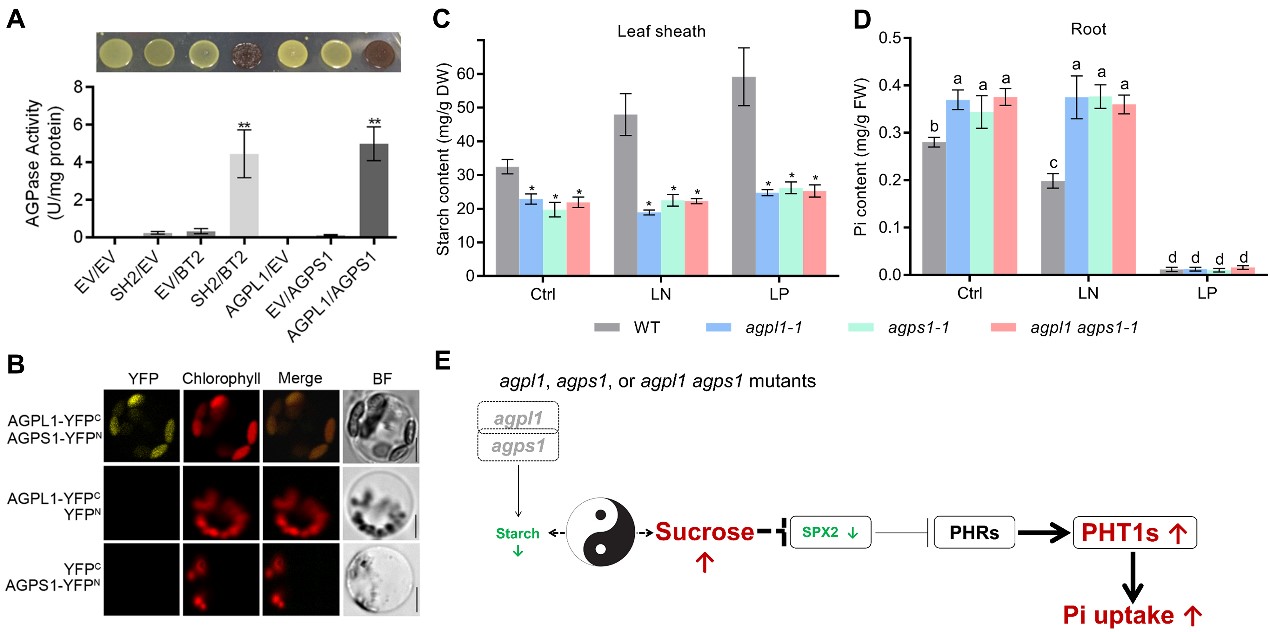(A-B)OsAGPL1和OsAGPS1在大肠杆菌和水稻原生质体的叶绿体中互作,并催化淀粉(糖元)合成;(C)OsAGPL1OsAGPS1突变导致淀粉积累显著降低,且淀粉积累对低氮(LN)和低磷(LP)胁迫的响应消失;(D)OsAGPL1OsAGPS1突变导致磷积累增加,且LN胁迫对磷积累的抑制作用消失;(E)OsAGPL1和OsAGPS1在碳代谢和维持磷稳态方面的工作模式图。