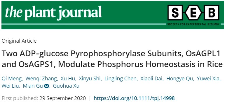 近日,徐国华教授团队在《The Plant Journal》发表了题为“Two ADP-glucose pyrophosphorylase subunits, OsAGPL1 and OsAGPS1, modulate phosphorus homeostasis in rice”的论文(doi: 10.1111/tpj.14998)。该研究以水稻中一对响应低氮和低磷胁迫的“二磷酸腺苷葡萄糖焦磷酸化酶”大(OsAGPL1)、小亚基(OsAGPS1)为研究对象,发现了其在“C-N-P”养分协同中的作用。