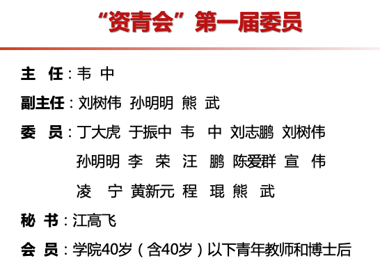 青年学术委员会的通知》以及第一届“资青会”委员名单。他肯定了“资青会”成立的必要性和重要性,表示学院行政和学术委员会全力支持“资青会”的发展。希望“资青会”在工作、学术和生活等方面发挥引领作用,带领青年教师跳出个人学术舒适区,有组织的参与到解决国家重大科学研究问题中去,群策群划、共谋发展。